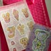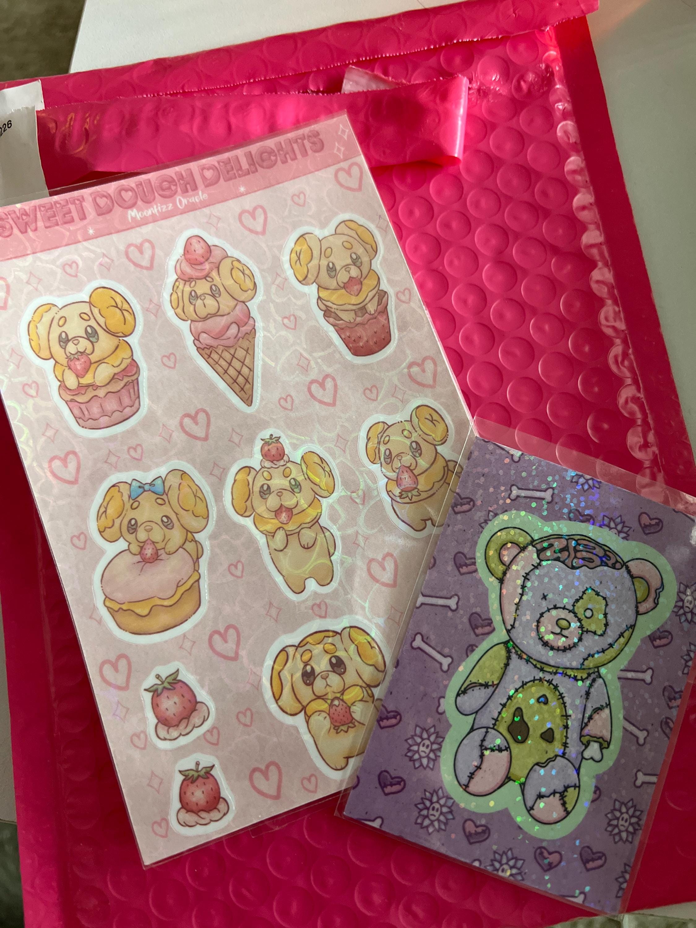 Bring home a batch of cuteness with this Sweet Dough Delights sticker sheet featuring everyone's favorite doughy pup — Fidough! Each sticker showcases a kawaii dessert-themed Fidough, from cupcakes to ice cream cones, lovingly illustrated in a soft pastel style. These stickers have a beautiful heart holographic finish that sparkles and shines, adding a magical touch to your journal, planner, laptop, or craft projects.